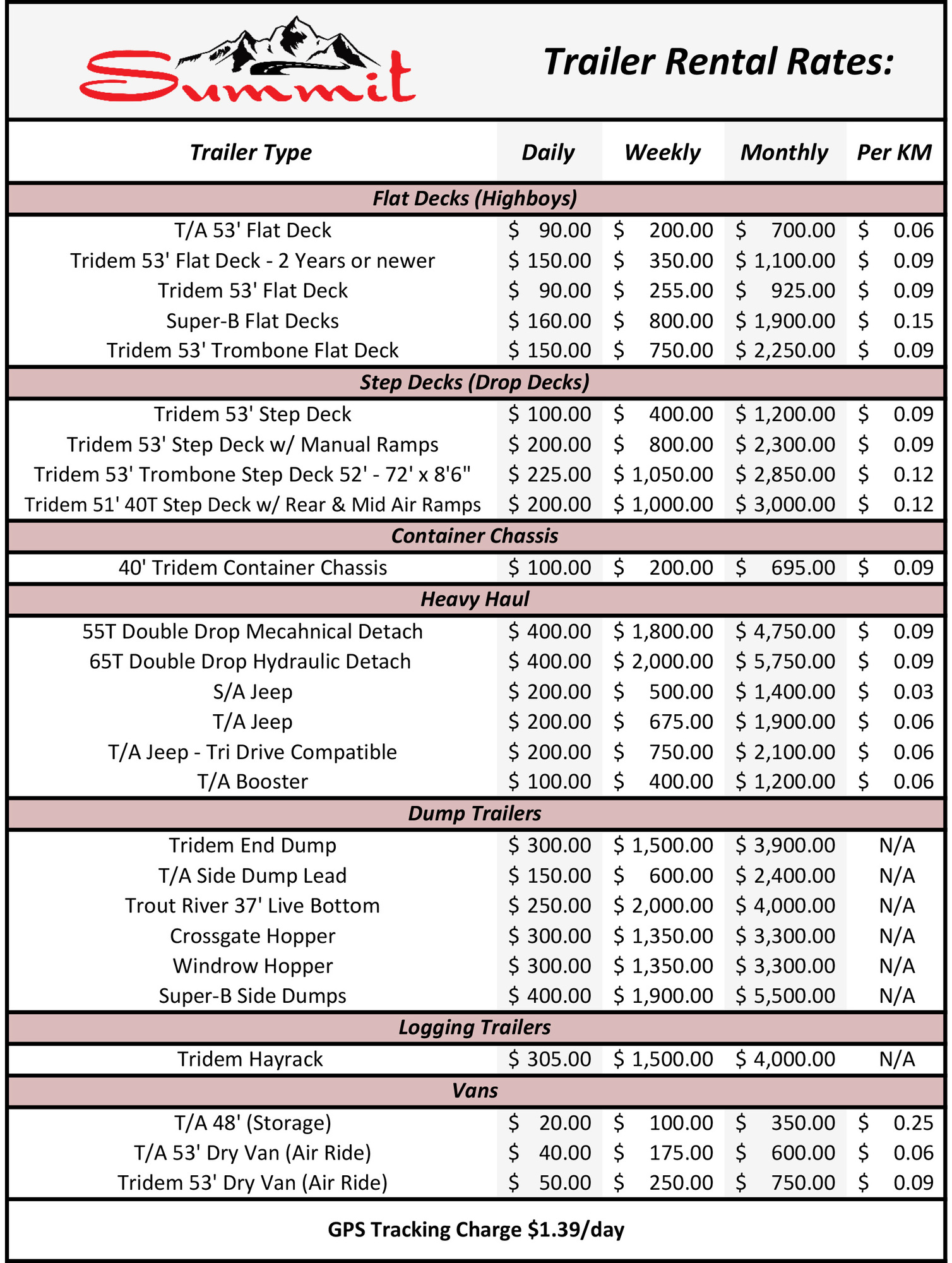 For more information on rates and trailer please call Summit Trailer Rentals Office at (587) 881-1195 or visit our Acheson location. Rates listed may be subject to change without notice.