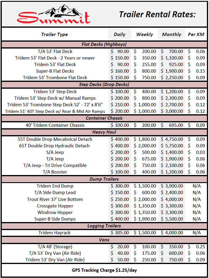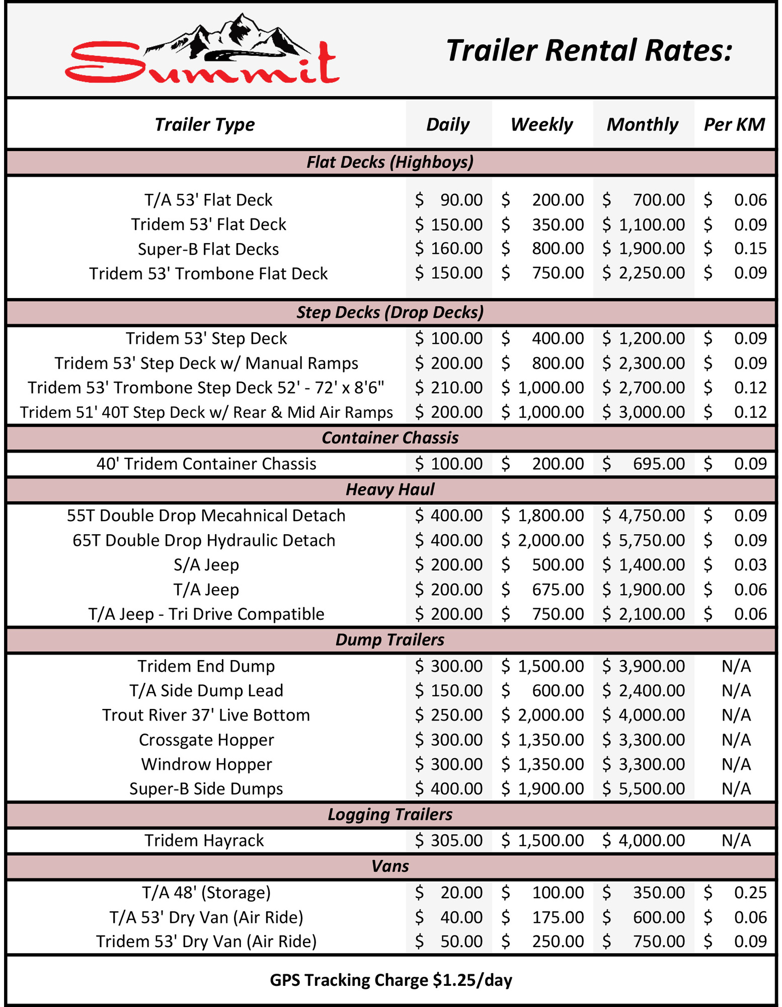 For more information on rates and trailer please call Summit Trailer Rentals Office at (587) 881-1195 or visit our Acheson location. Rates listed may be subject to change without notice.